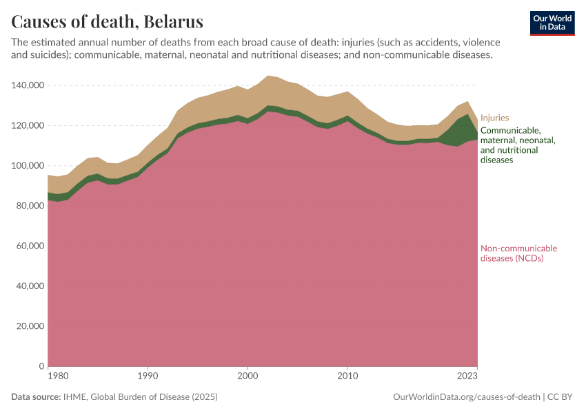 In the chart, you can see the breakdown of deaths in Belarus by these broad categories. In 2023, 3,500 died from communicable diseases, 113,000 from NCDs, and 6,360 from injuries.