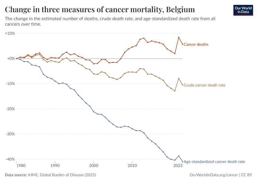 Are deaths from cancer in Belgium increasing or decreasing?