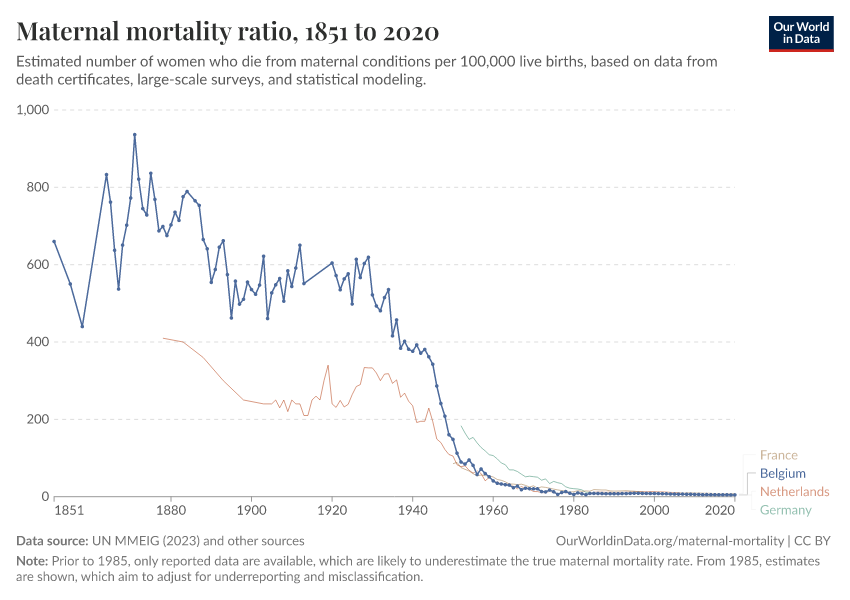In the chart, you can see Belgium’s maternal mortality rates over time, alongside neighboring countries for comparison. This is measured as the number of deaths per 100,000 live births.