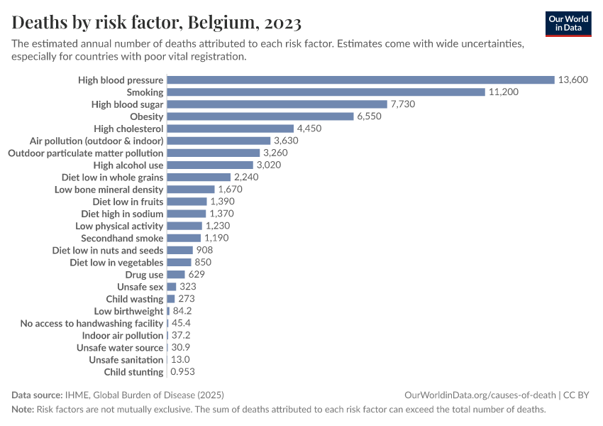 In the chart, you can see modeled estimates for how many people in Belgium die prematurely as a result of various risk factors. Note that the same death can be attributed to multiple risk factors, so the death tolls from different risk factors cannot simply be added up (this is why their sum can be higher than the total number of deaths).