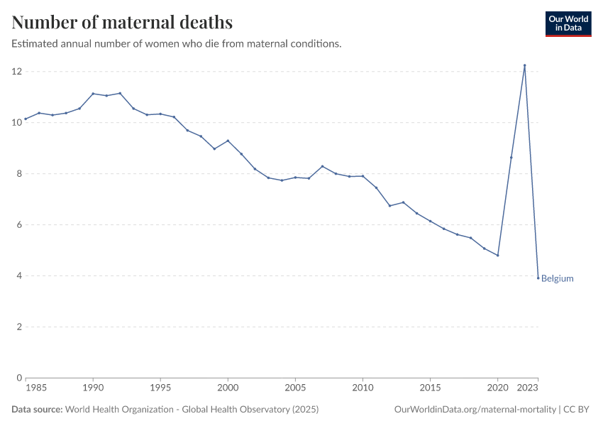 In the chart, you can see the number of women in Belgium who died during pregnancy or in childbirth each year. In 2023, this was 4 women.