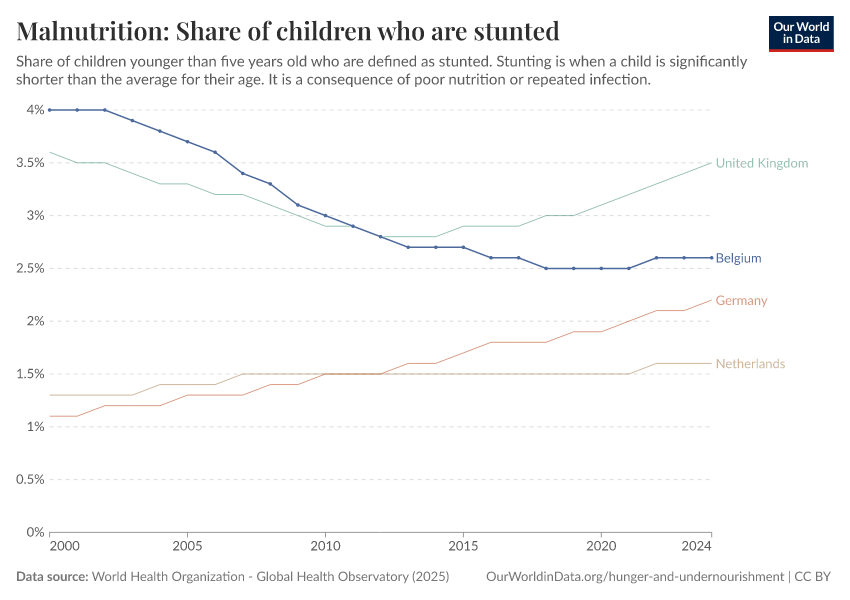 In the chart, you can see what share of children in Belgium are stunted, alongside neighboring countries. In 2024, this share was 2.6%.