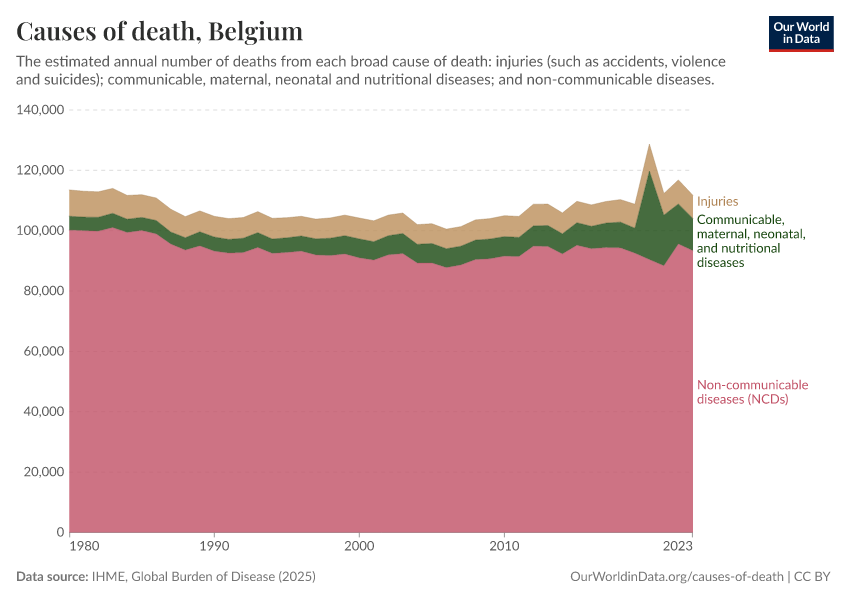 In the chart, you can see the breakdown of deaths in Belgium by these broad categories. In 2023, 10,700 died from communicable diseases, 93,400 from NCDs, and 7,670 from injuries.