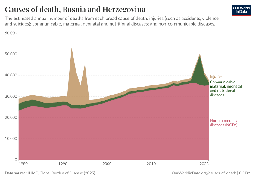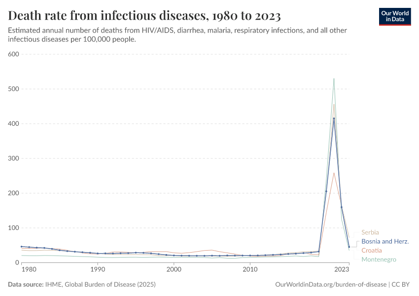 In the chart, you can see how death rates from communicable diseases in Bosnia and Herzegovina have changed over time. This is shown alongside neighboring countries for comparison.