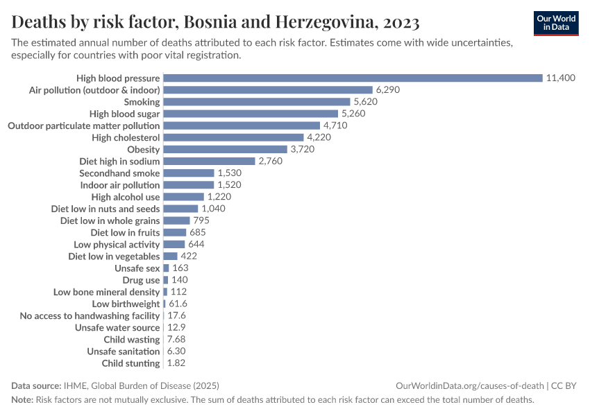 In the chart, you can see modeled estimates for how many people in Bosnia and Herzegovina die prematurely as a result of various risk factors. Note that the same death can be attributed to multiple risk factors, so the death tolls from different risk factors cannot simply be added up (this is why their sum can be higher than the total number of deaths).