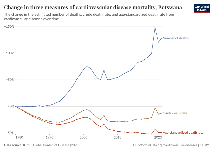 In the chart, you can see how death rates from communicable diseases in Botswana have changed over time. This is shown alongside neighboring countries for comparison.