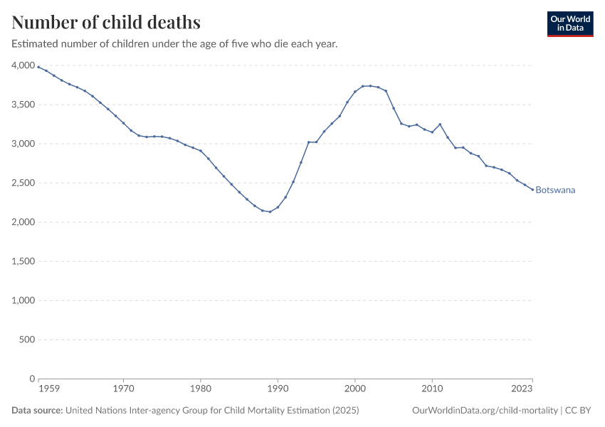 In the chart, you can see the number of children under five in Botswana who die in a particular year. In 2023, it was 2,420 children.