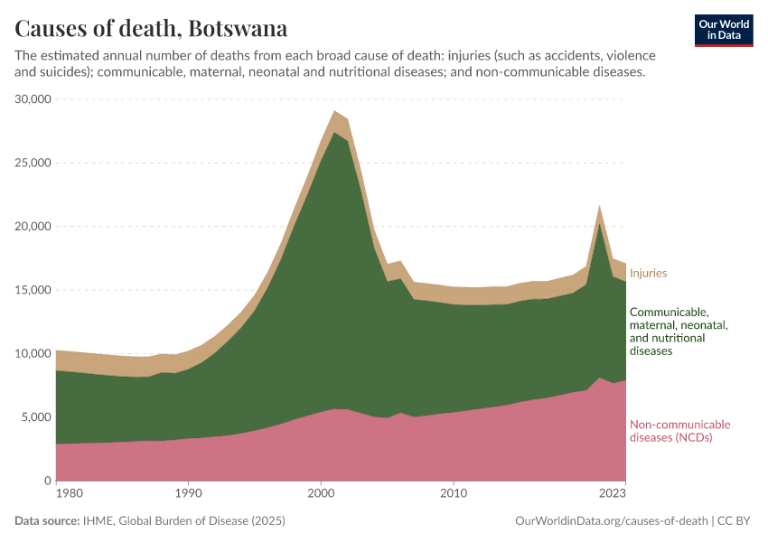 In the chart, you can see the breakdown of deaths in Botswana by these broad categories. In 2023, 7,760 died from communicable diseases, 7,900 from NCDs, and 1,420 from injuries.