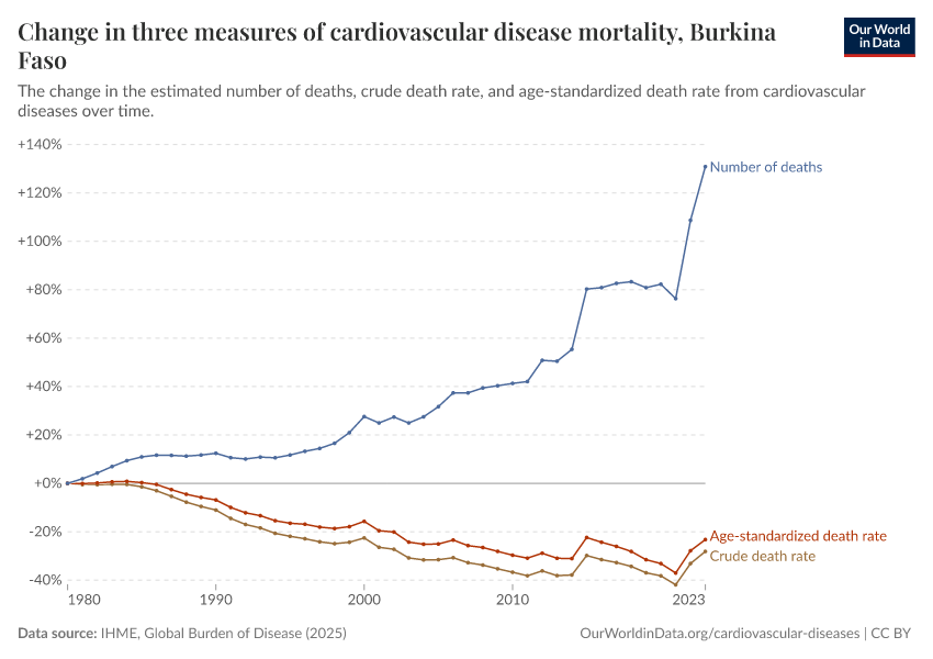 In the chart, you can see how death rates from communicable diseases in Burkina Faso have changed over time. This is shown alongside neighboring countries for comparison.