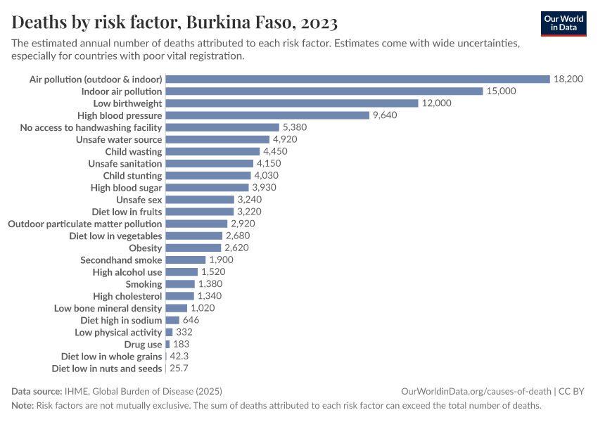 In the chart, you can see modeled estimates for how many people in Burkina Faso die prematurely as a result of various risk factors. Note that the same death can be attributed to multiple risk factors, so the death tolls from different risk factors cannot simply be added up (this is why their sum can be higher than the total number of deaths).
