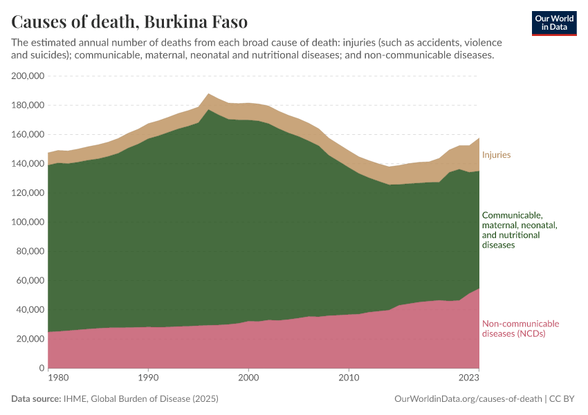 In the chart, you can see the breakdown of deaths in Burkina Faso by these broad categories. In 2023, 80,300 died from communicable diseases, 54,600 from NCDs, and 22,600 from injuries.
