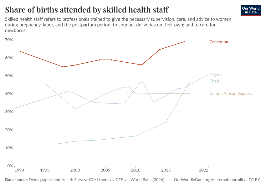 In the chart, you see the share of births attended by skilled workers in Cameroon, alongside its neighbors. In 2018, this share was 69%.