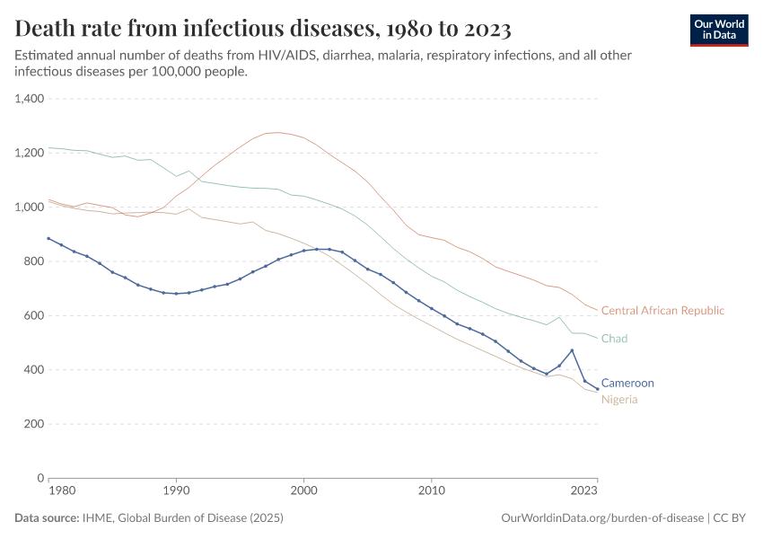 In the chart, you can see how death rates from communicable diseases in Cameroon have changed over time. This is shown alongside neighboring countries for comparison.