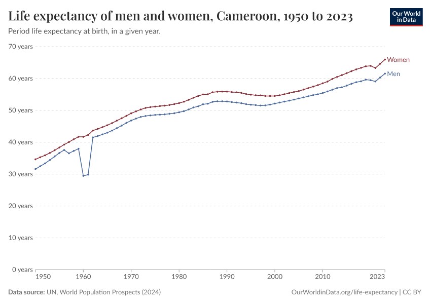 In the chart, you can see life expectancy at birth for men and women in Cameroon.