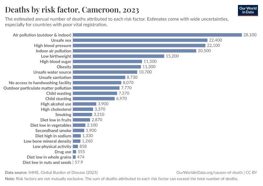 In the chart, you can see modeled estimates for how many people in Cameroon die prematurely as a result of various risk factors. Note that the same death can be attributed to multiple risk factors, so the death tolls from different risk factors cannot simply be added up (this is why their sum can be higher than the total number of deaths).