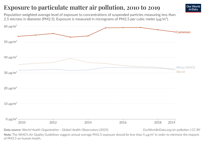 In the chart, you can see the average level of exposure to small suspended particles in Cameroon, compared to the global and regional averages.