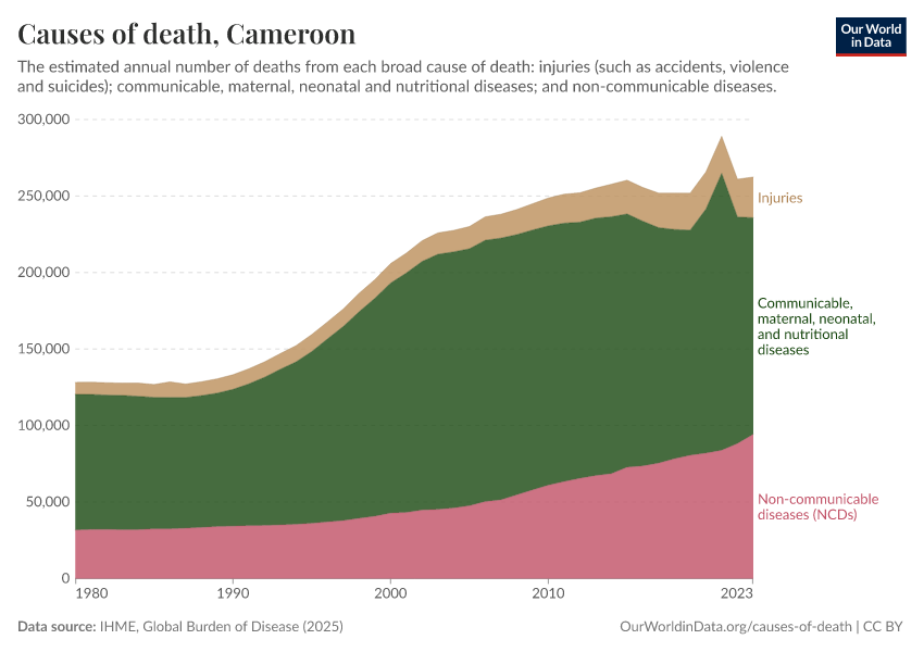 In the chart, you can see the breakdown of deaths in Cameroon by these broad categories. In 2023, 142,000 died from communicable diseases, 94,300 from NCDs, and 26,600 from injuries.