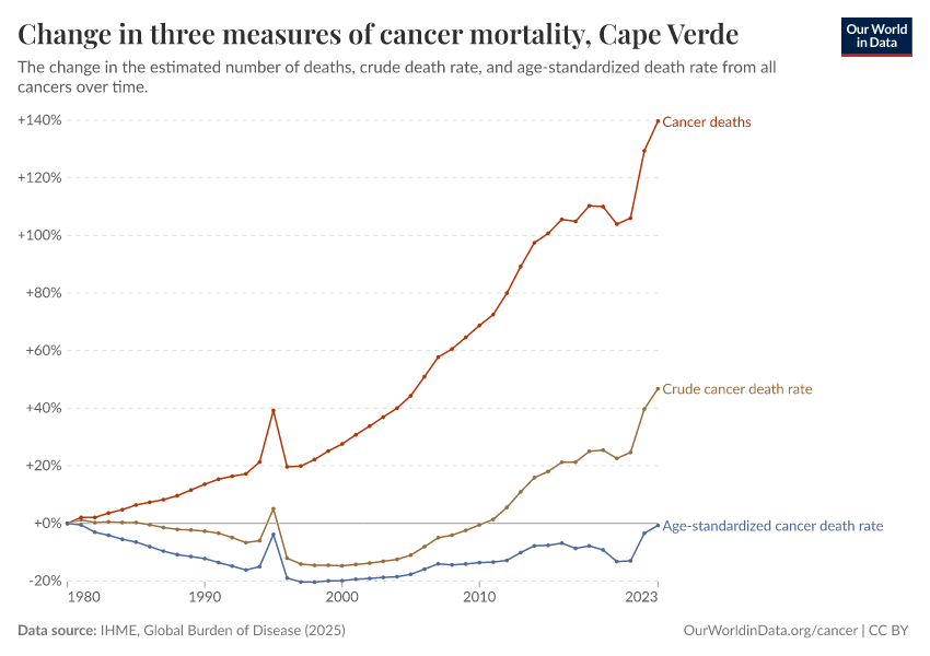 Again, we can use the same indicators to understand mortality: the total number of deaths, the crude death rate (which simply divides the number of deaths by the country’s population), or the age-standardized death rate, which holds the age structure of the population constant, so it tells us about how rates are changing regardless of aging. This is important because the risk of most cancers also increases steeply with age.