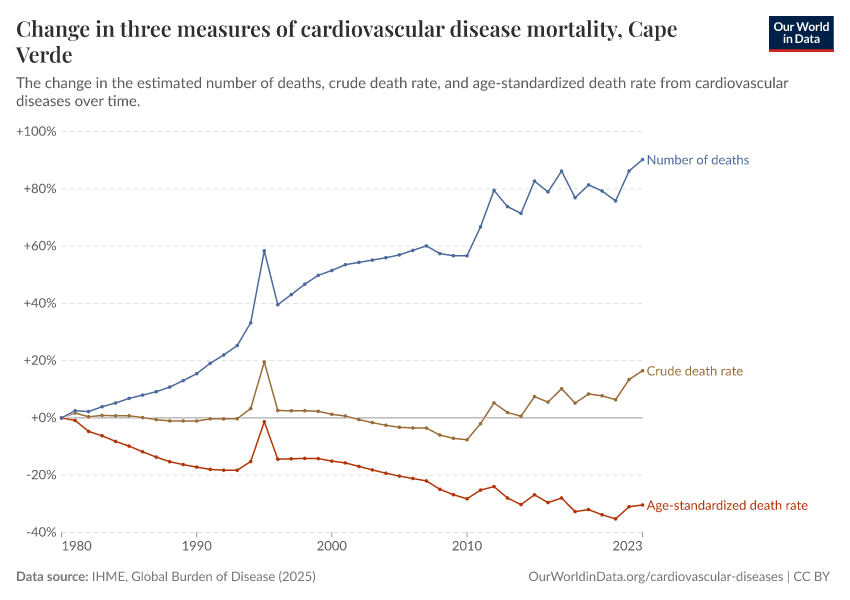 In the chart, you can see how death rates from communicable diseases in Cape Verde have changed over time. This is shown alongside neighboring countries for comparison.