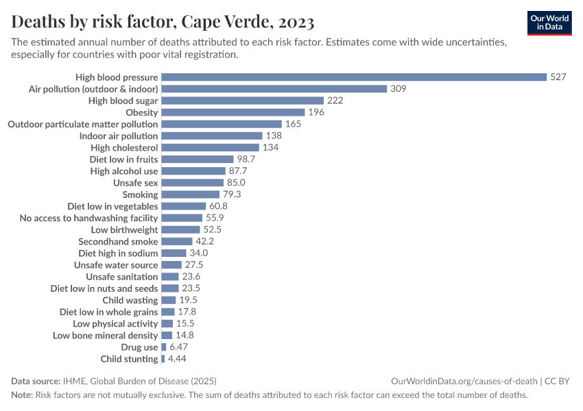 In the chart, you can see modeled estimates for how many people in Cape Verde die prematurely as a result of various risk factors. Note that the same death can be attributed to multiple risk factors, so the death tolls from different risk factors cannot simply be added up (this is why their sum can be higher than the total number of deaths).
