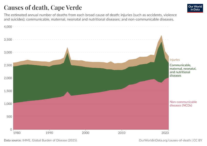 In the chart, you can see the breakdown of deaths in Cape Verde by these broad categories. In 2023, 565 died from communicable diseases, 2,030 from NCDs, and 262 from injuries.