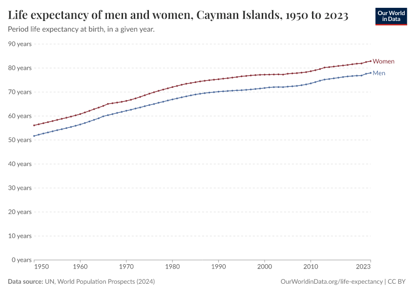 In the chart, you can see life expectancy at birth for men and women in the Cayman Islands.