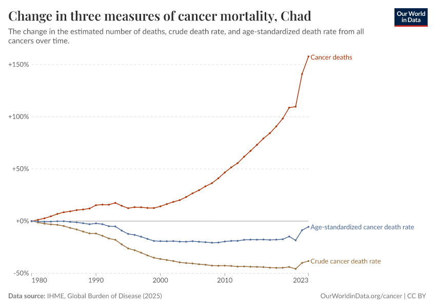 Again, we can use the same indicators to understand mortality: the total number of deaths, the crude death rate (which simply divides the number of deaths by the country’s population), or the age-standardized death rate, which holds the age structure of the population constant, so it tells us about how rates are changing regardless of aging. This is important because the risk of most cancers also increases steeply with age.