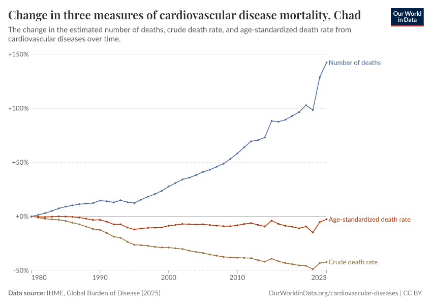 In the chart, you can see how death rates from communicable diseases in Chad have changed over time. This is shown alongside neighboring countries for comparison.