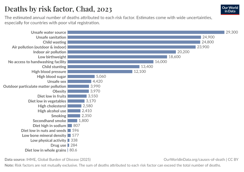 In the chart, you can see modeled estimates for how many people in Chad die prematurely as a result of various risk factors. Note that the same death can be attributed to multiple risk factors, so the death tolls from different risk factors cannot simply be added up (this is why their sum can be higher than the total number of deaths).