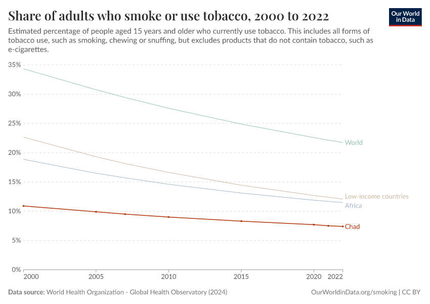 In the chart, you can see the share of adults in Chad who use tobacco. This is shown alongside the average globally and regionally.
