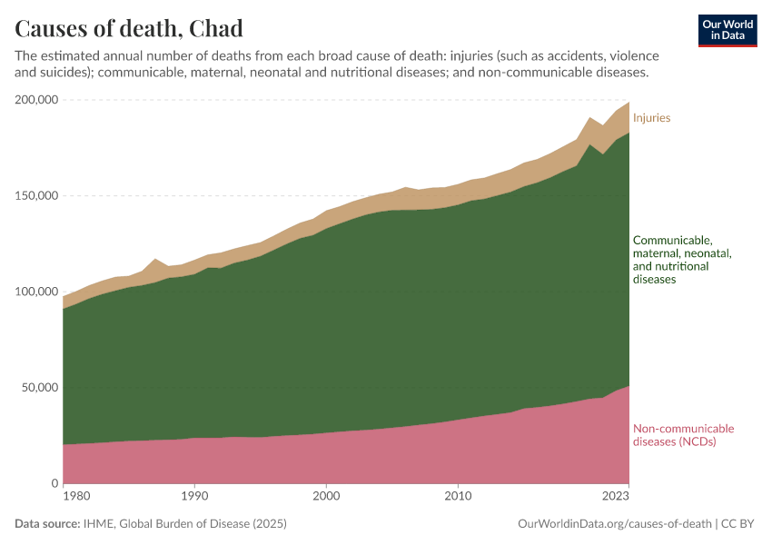 In the chart, you can see the breakdown of deaths in Chad by these broad categories. In 2023, 132,000 died from communicable diseases, 50,900 from NCDs, and 16,000 from injuries.