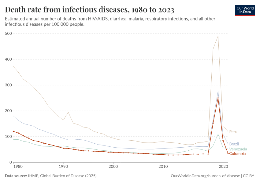 In the chart, you can see how death rates from communicable diseases in Colombia have changed over time. This is shown alongside neighboring countries for comparison.