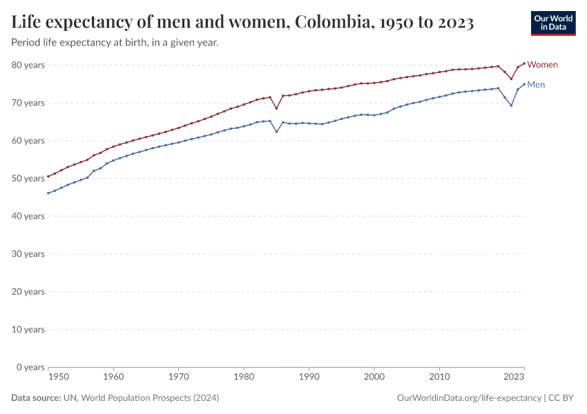 In the chart, you can see life expectancy at birth for men and women in Colombia.