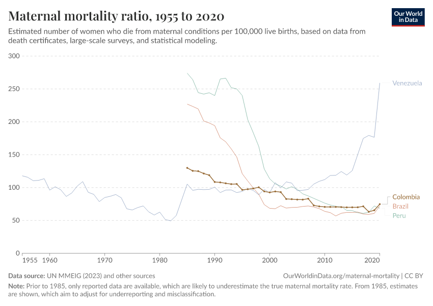 In the chart, you can see Colombia’s maternal mortality rates over time, alongside neighboring countries for comparison. This is measured as the number of deaths per 100,000 live births.