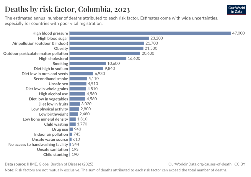 In the chart, you can see modeled estimates for how many people in Colombia die prematurely as a result of various risk factors. Note that the same death can be attributed to multiple risk factors, so the death tolls from different risk factors cannot simply be added up (this is why their sum can be higher than the total number of deaths).