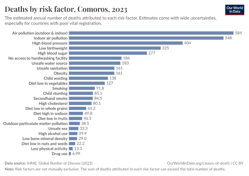 In the chart, you can see modeled estimates for how many people in the Comoros die prematurely as a result of various risk factors. Note that the same death can be attributed to multiple risk factors, so the death tolls from different risk factors cannot simply be added up (this is why their sum can be higher than the total number of deaths).