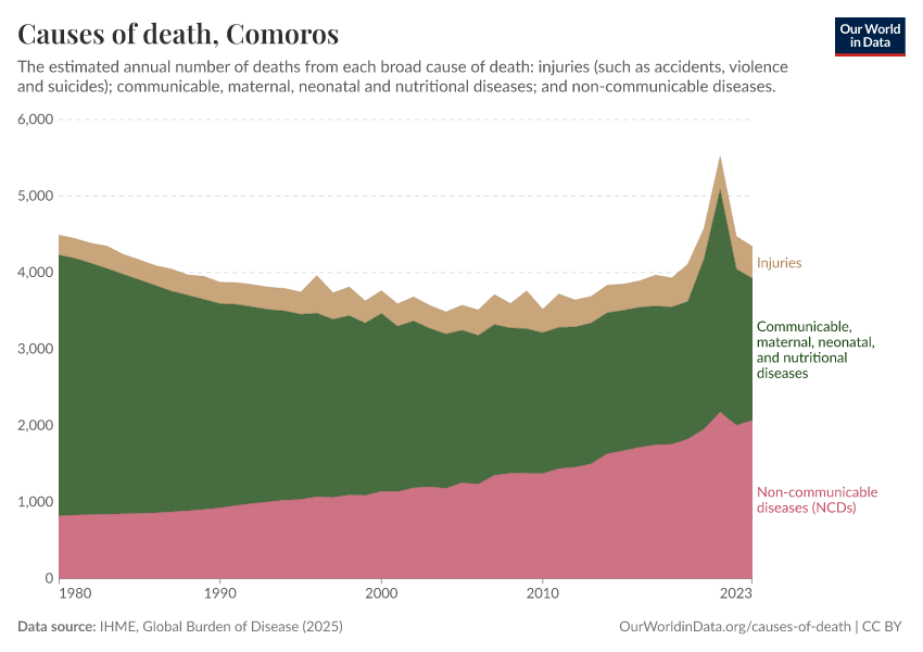 In the chart, you can see the breakdown of deaths in the Comoros by these broad categories. In 2023, 1,860 died from communicable diseases, 2,070 from NCDs, and 416 from injuries.