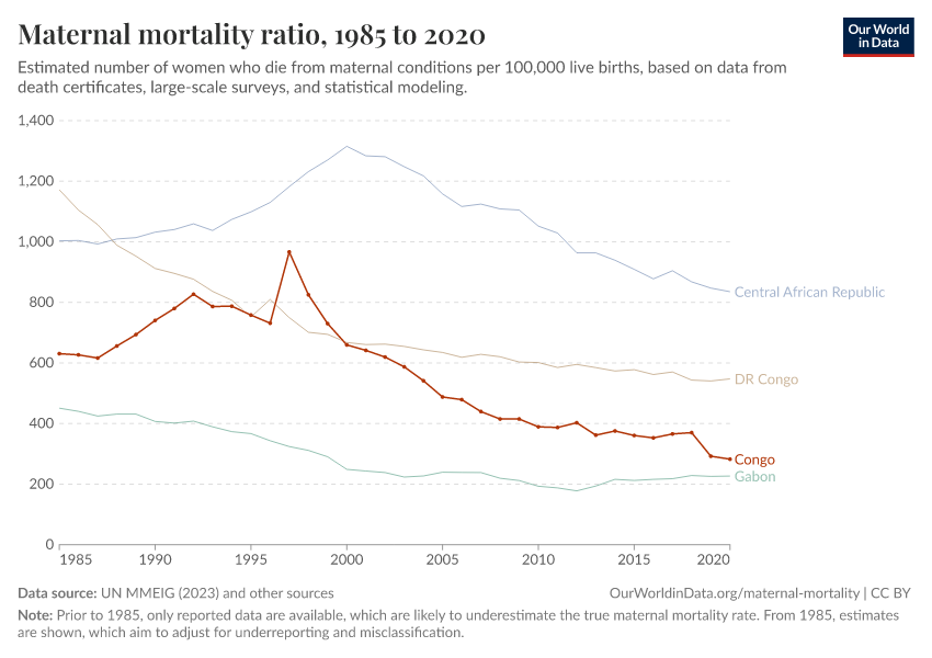In the chart, you can see the Congo’s maternal mortality rates over time, alongside neighboring countries for comparison. This is measured as the number of deaths per 100,000 live births.
