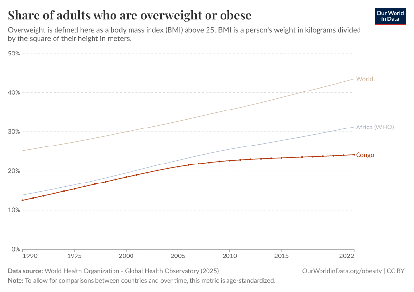 In the chart, you can see the share of adults in the Congo who are overweight or obese. This is defined as having a body mass index (BMI) equal to or greater than 25. This is shown alongside the global and regional averages.