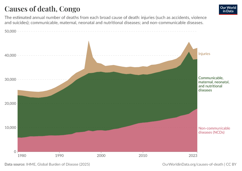 In the chart, you can see the breakdown of deaths in the Congo by these broad categories. In 2023, 20,500 died from communicable diseases, 17,900 from NCDs, and 4,650 from injuries.