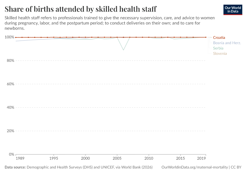 In the chart, you see the share of births attended by skilled workers in Croatia, alongside its neighbors. In 2019, this share was 100%.