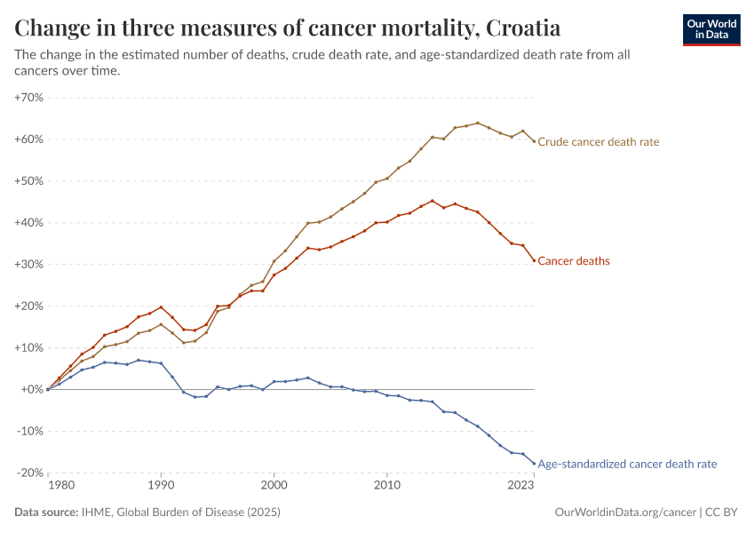 Again, we can use the same indicators to understand mortality: the total number of deaths, the crude death rate (which simply divides the number of deaths by the country’s population), or the age-standardized death rate, which holds the age structure of the population constant, so it tells us about how rates are changing regardless of aging. This is important because the risk of most cancers also increases steeply with age.
