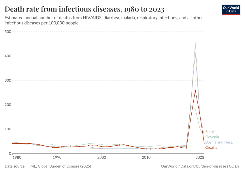 In the chart, you can see how death rates from communicable diseases in Croatia have changed over time. This is shown alongside neighboring countries for comparison.