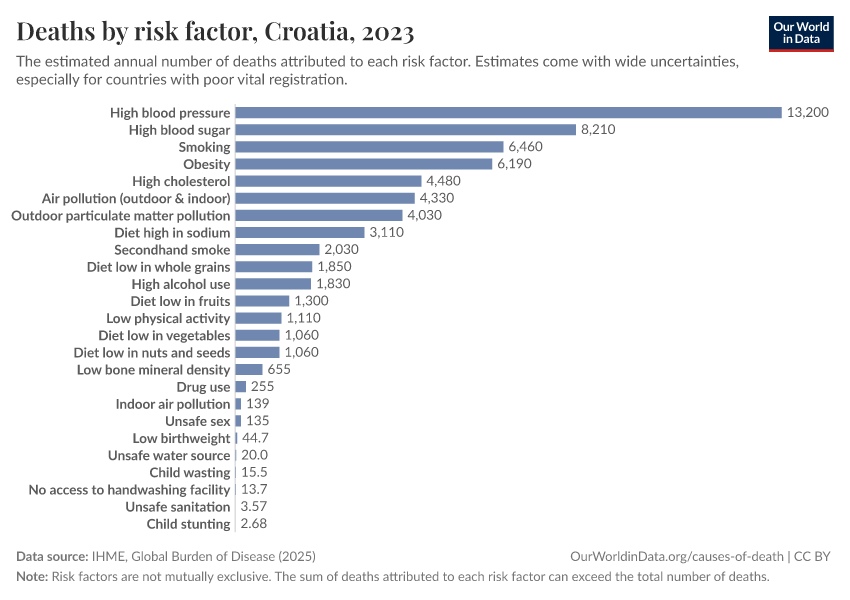 In the chart, you can see modeled estimates for how many people in Croatia die prematurely as a result of various risk factors. Note that the same death can be attributed to multiple risk factors, so the death tolls from different risk factors cannot simply be added up (this is why their sum can be higher than the total number of deaths).