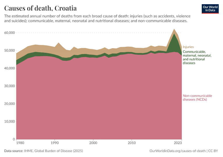 In the chart, you can see the breakdown of deaths in Croatia by these broad categories. In 2023, 1,740 died from communicable diseases, 47,100 from NCDs, and 3,070 from injuries.