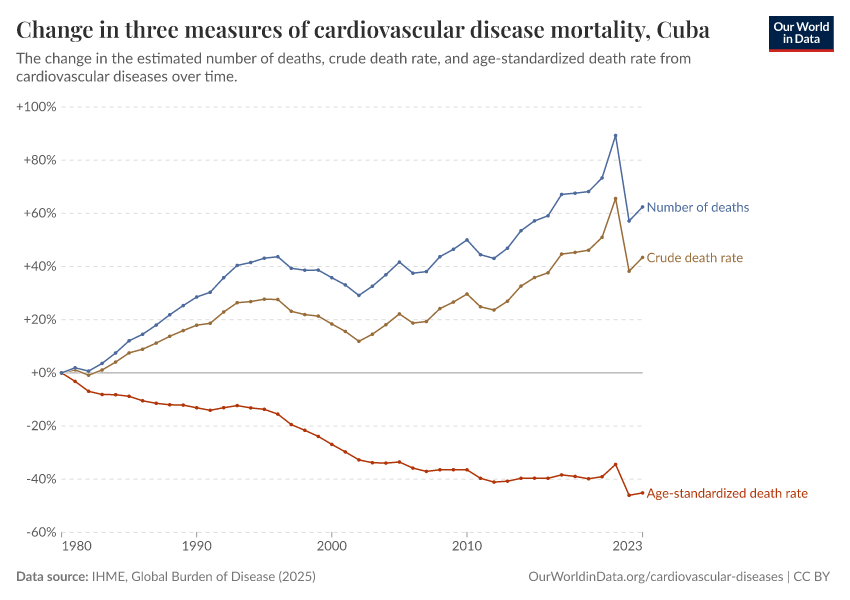 In the chart, you can see how death rates from communicable diseases in Cuba have changed over time. This is shown alongside neighboring countries for comparison.