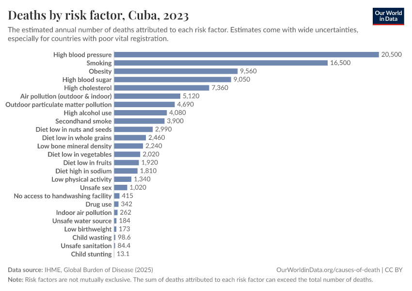 In the chart, you can see modeled estimates for how many people in Cuba die prematurely as a result of various risk factors. Note that the same death can be attributed to multiple risk factors, so the death tolls from different risk factors cannot simply be added up (this is why their sum can be higher than the total number of deaths).