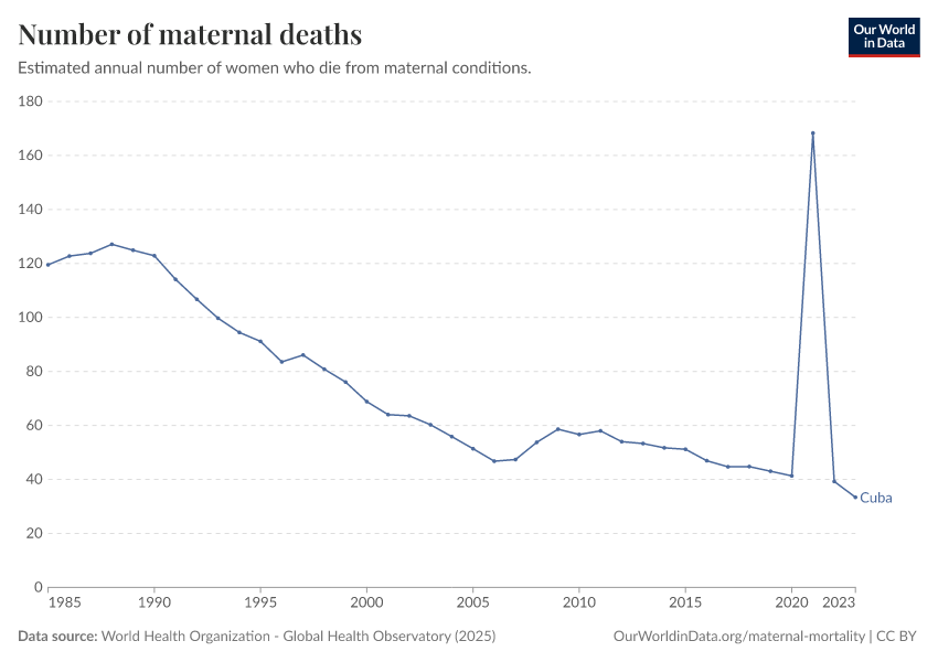 In the chart, you can see the number of women in Cuba who died during pregnancy or in childbirth each year. In 2023, this was 33 women.