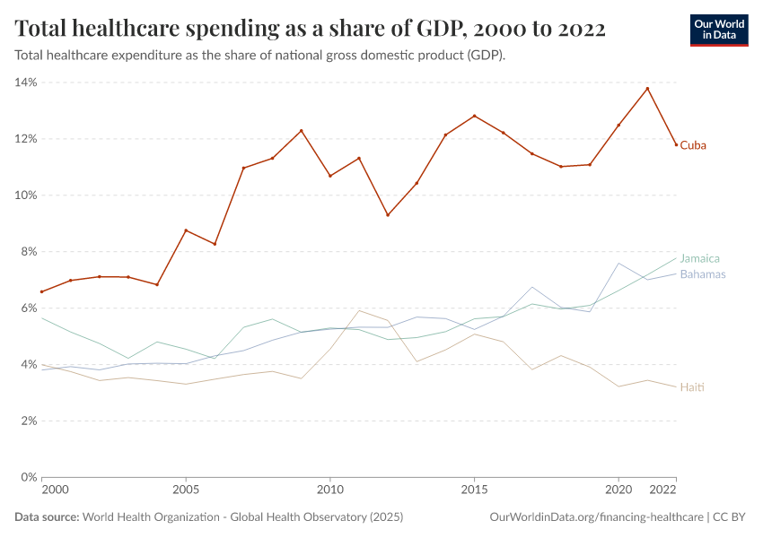 In 2022, Cuba’s healthcare spending was equivalent to 12% of its national gross domestic product (GDP).