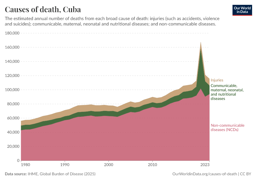 In the chart, you can see the breakdown of deaths in Cuba by these broad categories. In 2023, 12,300 died from communicable diseases, 93,900 from NCDs, and 9,400 from injuries.